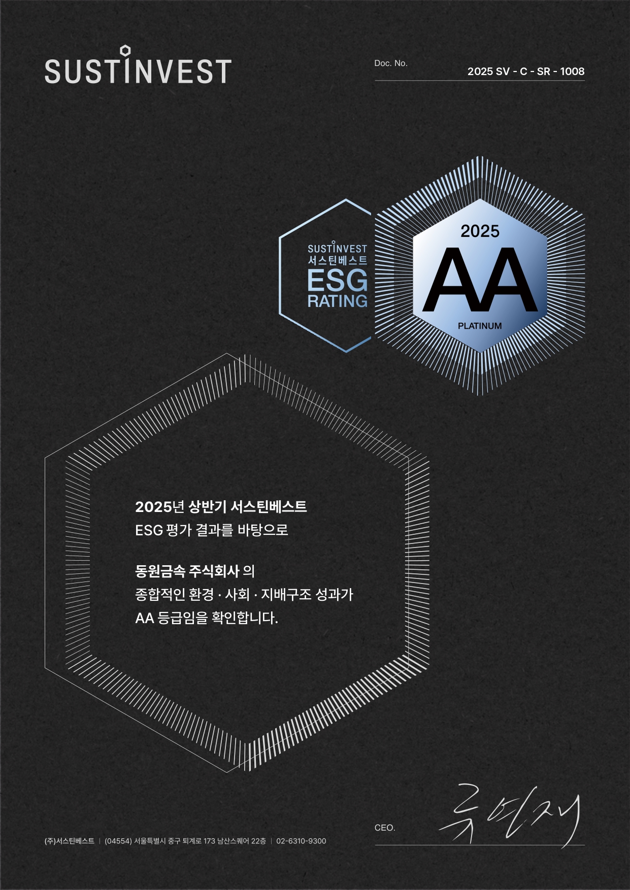 특히 서스틴베스트는 요약 보고서를 통해 “동원금속의 2025년 하반기 ESG 등급은 AA 등급으로 투자 적격 수준에 해당하며, 최고등급이 꾸준히 유지될 수 있도록 지속적인 ESG 관리가 필요하다”고 평가했다. 이는 당사의 ESG경영 실천이 외부 이해관계자들로부터 신뢰를 받고 있음을 보여주는 중요한 메시지이다.
