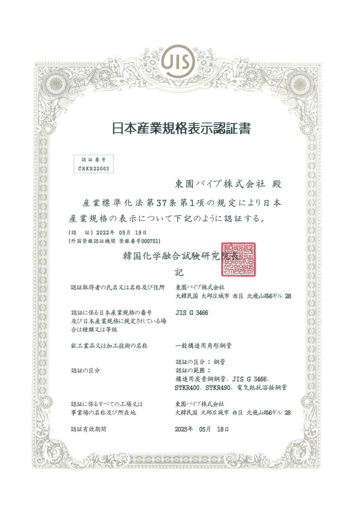 Dongwon Pipe Co., Ltd Quality (JIS) Certificate