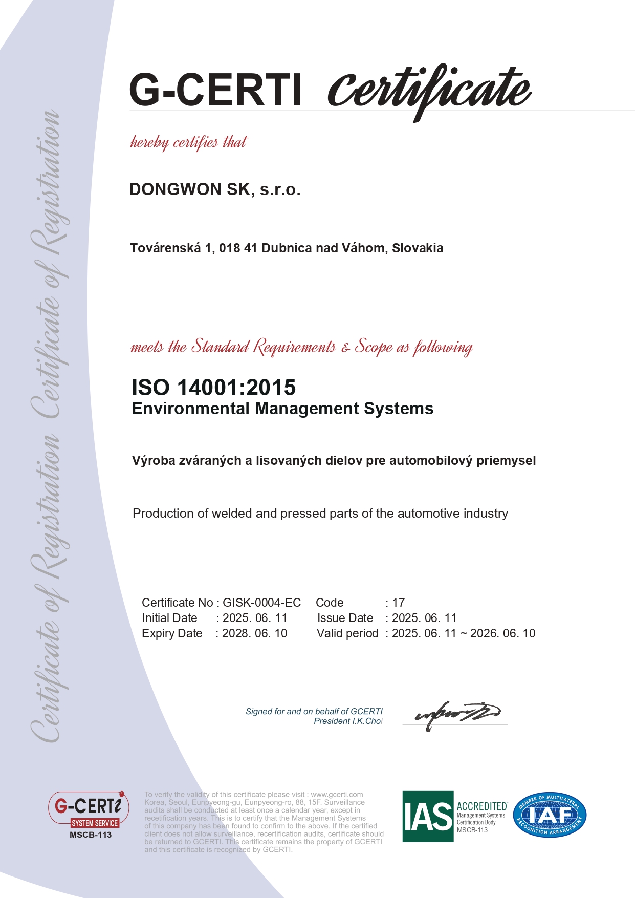 동원 슬로바키아(DWSK) 환경(ISO14001) 인증서