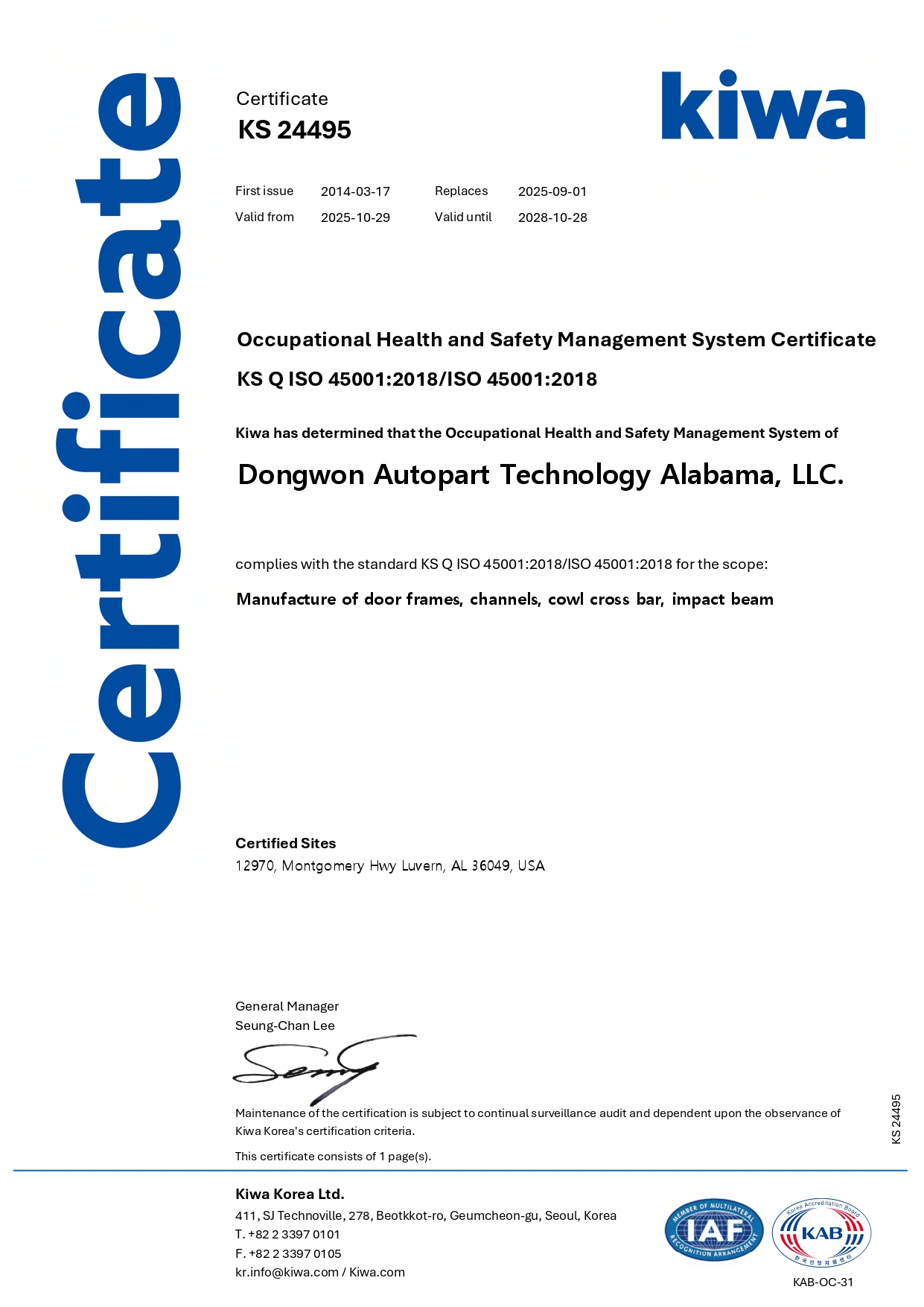 동원 앨라배마 (DATA) 안전보건(ISO45001) 인증서