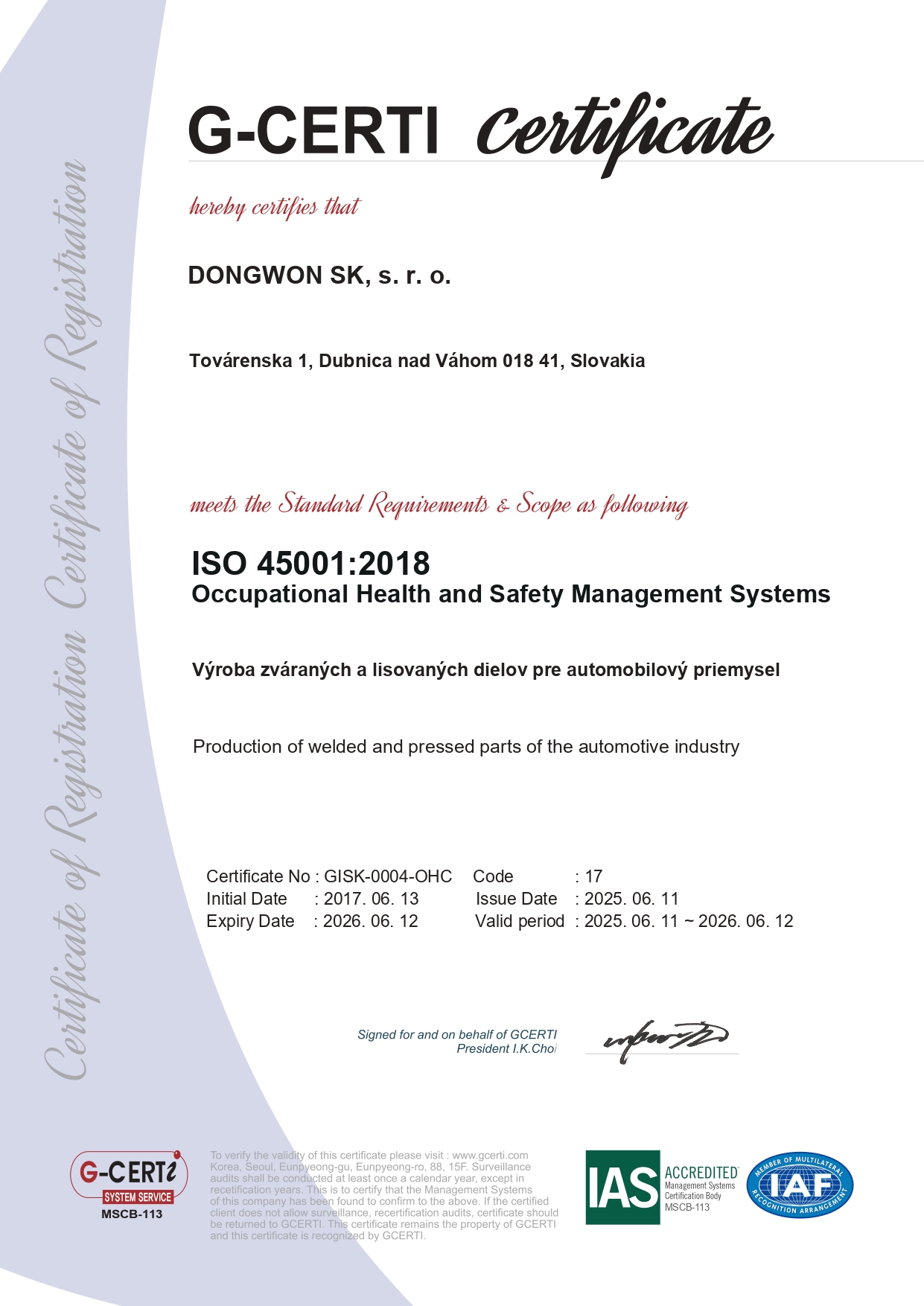 동원 슬로바키아(DWSK) 안전보건(ISO45001) 인증서