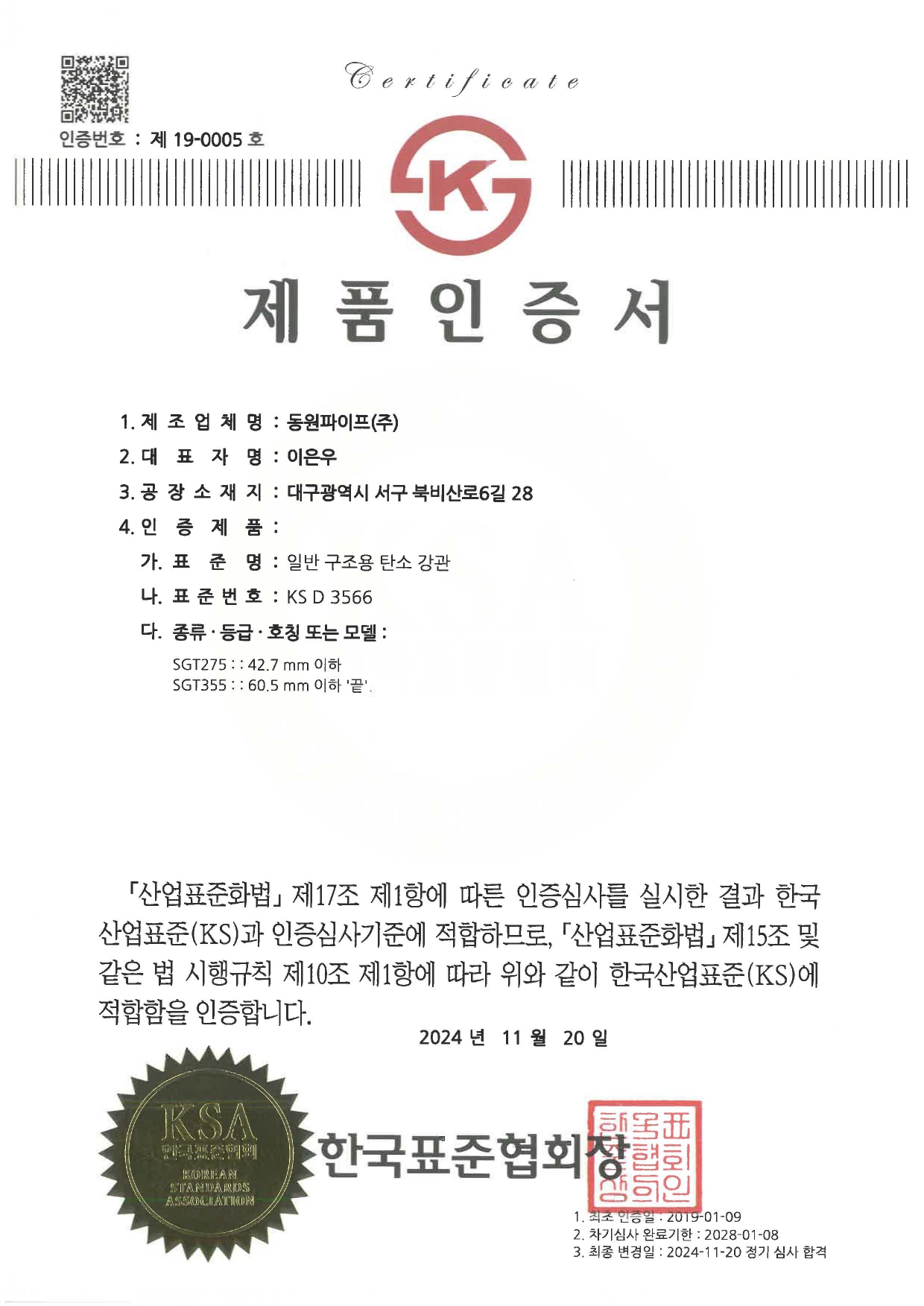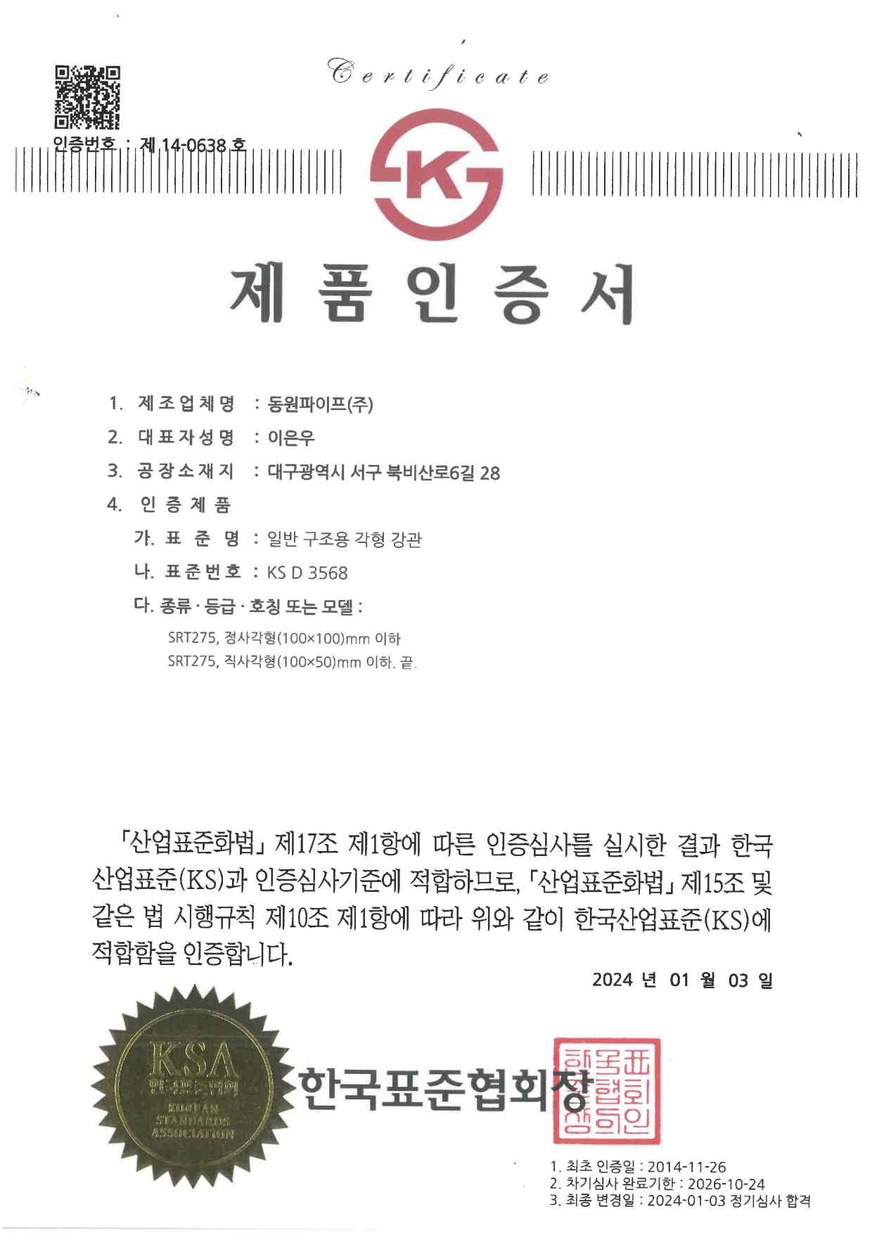유효기간: 배관용 탄소 강관 2024-09-11 ~ 2027-07-15 일반 구조용 탄소 강관 2024-11-20 ~ 2028-01-08 일반 구조용 각형 강관 2024-01-03 ~ 2026-10-24
