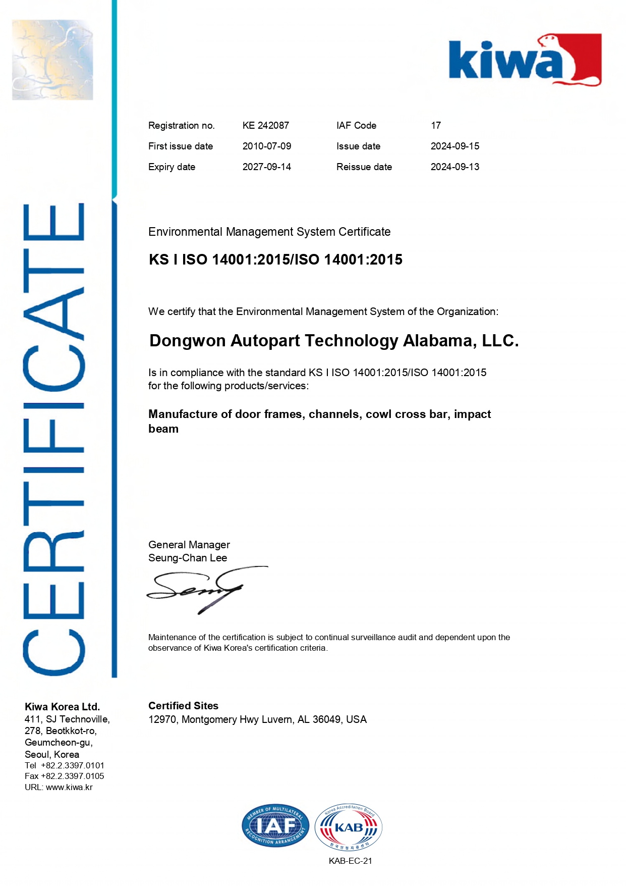 동원 앨라배마(DATA) 환경(ISO14001) 인증서