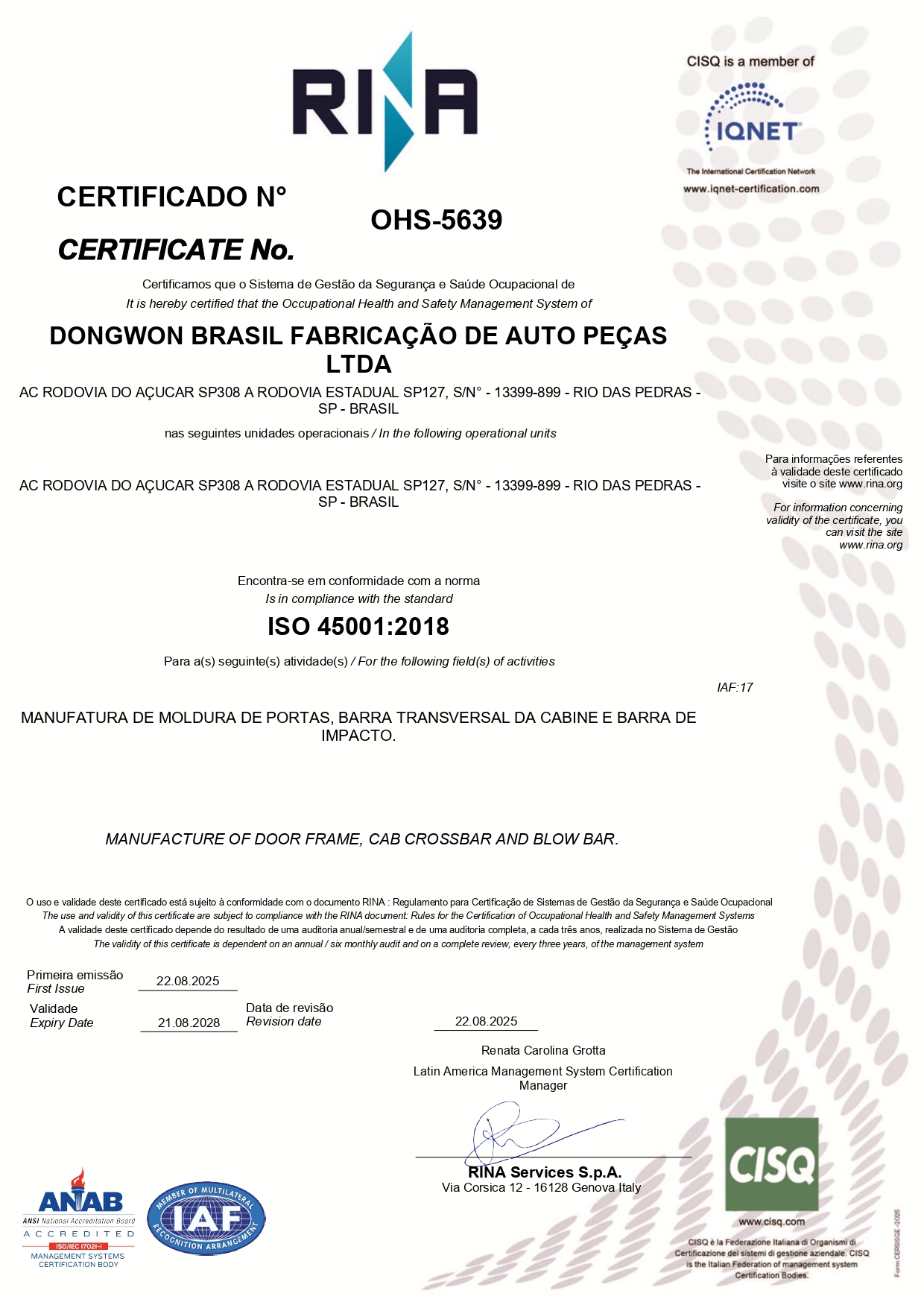 DW Brazil (Piracicaba) (DWBRP) Health and Safety (ISO45001) Certificate