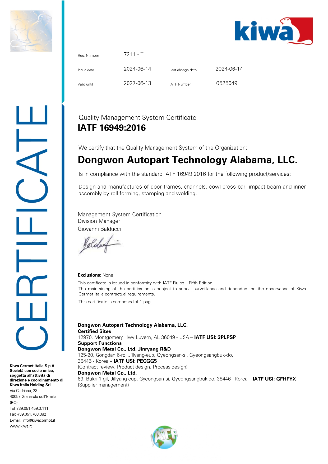 DW Alabama (DATA) Quality (IATF16949) Certificate
