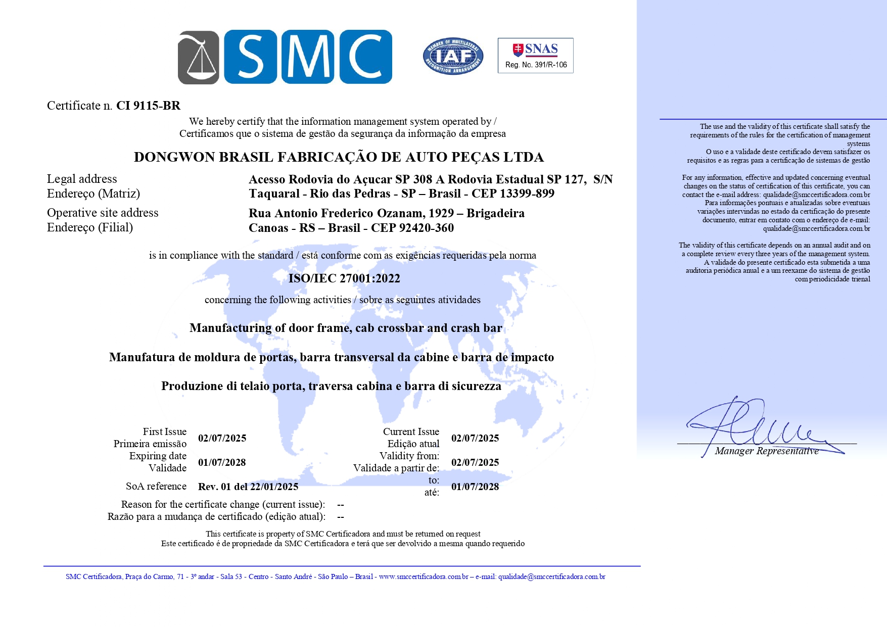 DW Brazil (Piracicaba) (DWBRP) Information Security (TISAX / ISO 27001) Certificate